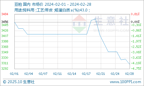 据生意社商品行情分析系统显示:2月豆粕行情反弹乏力,振荡下跌,跌幅超4%。2月1日,豆粕市场均价3456元/吨,2月28日,豆粕市场均价3456元/吨,价格下跌4.28%。