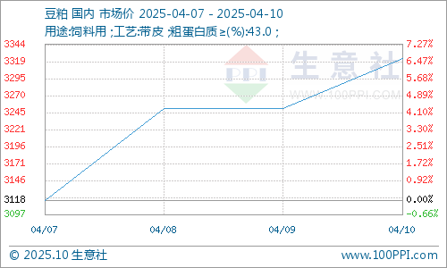 据生意社商品分析系统显示:清明节后,受关税政策影响,豆粕行情迎来好转,价格不断上扬。4月7日,豆粕市场均价3118元/吨,4月10日,豆粕市场均价3324元/吨,价格上涨6.61%。